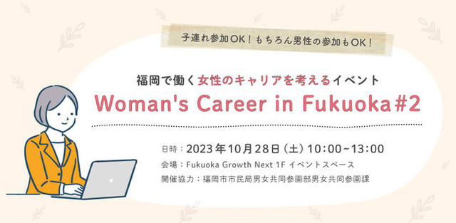 4つのセッションから女性のキャリアを考えるイベントです。開催にあたり、福岡市 市民局 男女共同参画課にもご協力いただき、福岡の雇用市場をエンパワーメントすることを目的としています。