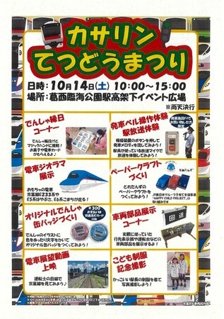 ジェイアール東日本都市開発では、心地よいくらしづくり、住みたくなるまちづくりの実現に向けて、その地域に暮らす、働く、関わる人々とともにくらしとまちに向き合っていく様々な試みを推進しています。この度、2023年10月14日(土)に、JR千葉支社京葉ベイサイドラインプロジェクトの皆さまと「カサリンてつどうまつり」へ協力いたします。京葉線葛西臨海公園高架下で、「でんしゃ縁日」や「こども制服記念撮影」「発車ベル操作体験・駅放送体験」等の盛りだくさんのイベントをおこないます。また、葛西臨海公園高架下ビル内のFfにもご協力いただき、10月6日(金)から10月15日(日)までFf1階催事コーナーにて「紀ノ国屋特別販売」も実施いたしますので、ご案内いたします。