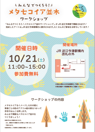 当日は湖西線内の観光名所である「メタセコイア並木(滋賀県高島市)」をモチーフに、成安造形大学の学生と一緒に作品を制作できますので、是非ご参加ください。制作した作品は、2023年12月頃から近江今津駅に展示する予定です。