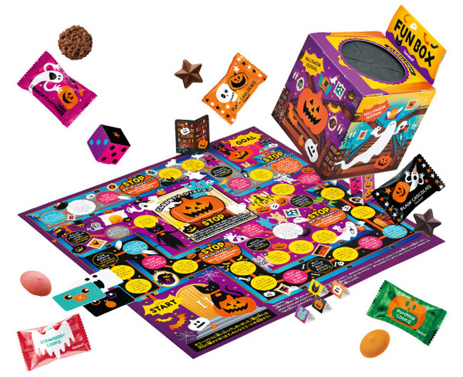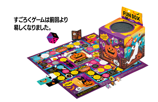 毎年人気の「ハロウィンファンボックス」は、キューブ型の箱の中に、ハロウィンのお菓子とみんなで遊べるすごろくゲームがついています。コマをミシン目からはずし、サイコロを組み立てたらゲームスタート!