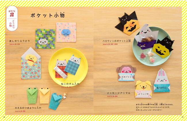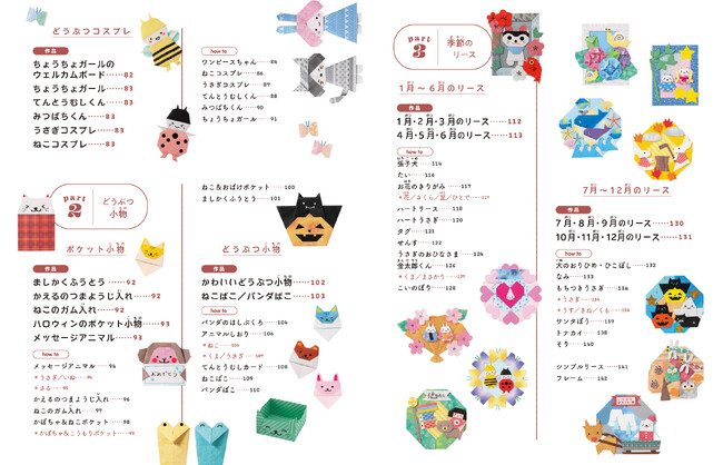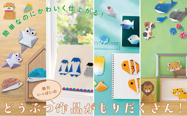 犬・ねこ・うさぎ・小鳥といった身近などうぶつから、ライオン・トラ・パンダ・レッサーパンダなどの動物園の人気者、イルカ・あざらし・ペンギン・1枚でしましま模様まで折れるクマノミなど水族館の人気者、季節の飾りで使いやすいあじさいとかたつむり、とんぼともみじなどカミキィさん作品ならではのかわいらしいフォルムのどうぶつたちが満載。