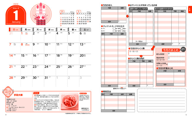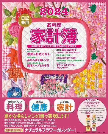 70年以上愛され続けるお料理家計簿! 日記感覚でつけられるお料理家計簿のロングセラーは、給料日決算、月末決算でも自由に記帳できてとても便利。旬の食材を使った、毎日の食卓に役立つレシピも満載で、巻頭特集は料理研究家・藤野嘉子さんの“華やかで心はずむ”おもてなし料理を紹介。また、料理研究家で管理栄養士でもある藤井恵さんの「高たんぱく質レシピ」、「腸活スープとみそ汁」の体にいいレシピの特集も。