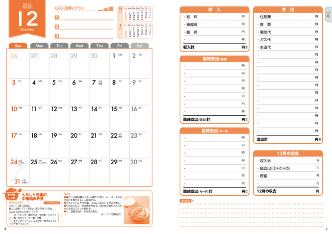 家計簿ページには、見開きごとに主菜・副菜の献立おかずを掲載。料理研究家の岩崎啓子さんと本田明子さんが旬の食材を使った、栄養バランスのよい料理を紹介しています。