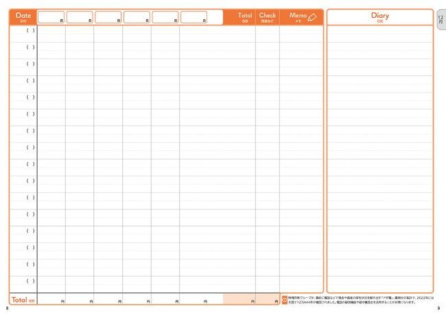 ▲はじめて使う人にも書きやすいフォーマット。日付入りメモ欄は、ひとこと日記にも便利。