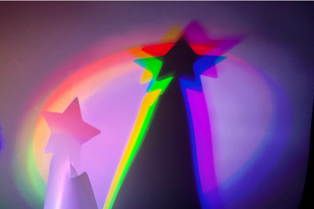 「光の三原色LEDライト」と黒い紙をつかって、赤色・青色・緑色の光を合わせて色を作ります。赤色と青色をたすと何色になるのか、また三色をたすとどうなるのか、実際にライトで色をたして実験します。絵の具を混ぜて色をつくるときとは全く違う、光のたし算を楽しみます。また、身の回りにあるテレビやパソコンのディスプレイに映し出されるカラー映像がどのようにして作られているのか、その仕組みも学びます。