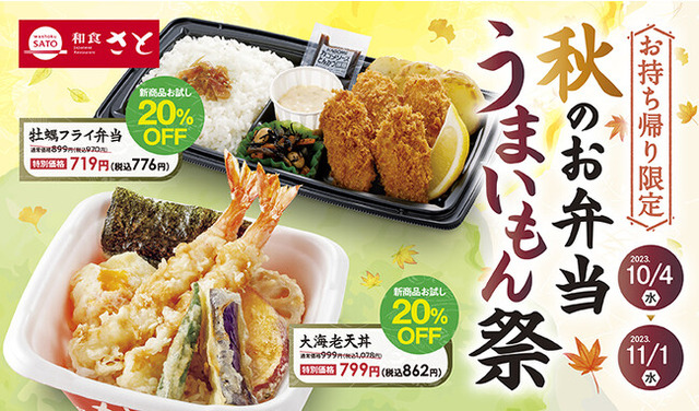 国内197店舗を展開する「和食さと」では、「秋のお弁当うまいもん祭キャンペーン」と題して、テイクアウトの新作メニュー2品を【20%OFF】で販売するほか、牛タンのお弁当を期間限定で販売する特別キャンペーンを開催します。