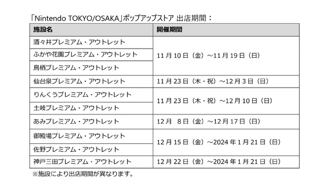 任天堂のオフィシャルストア「Nintendo TOKYO/OSAKA」のポップアップストアが、全国のプレミアム・アウトレットに期間限定で登場します。「スーパーマリオ」「スプラトゥーン」「どうぶつの森」「ゼルダの伝説」など人気のゲームシリーズのグッズや、「Nintendo TOKYO/OSAKA」などの店頭でしか買えない商品の一部も販売予定です。