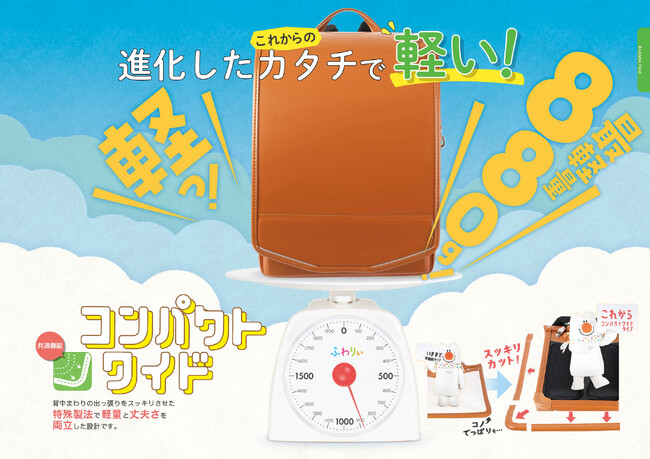 ふわりぃランドセル最大の特徴は「軽さ」です。発売以来軽量化にこだわり商品開発を行ってきました。背中まわりの出っ張りをスッキリさせた「コンパクトワイド」製法で880gの軽量化を実現させました。
