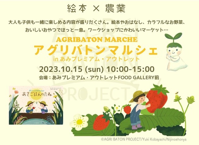 あみプレミアム・アウトレット(所在地:茨城県稲敷郡阿見町 運営:三菱地所・サイモン株式会社)では、2023年10月15日(日)に、お子様と一緒に楽しみながら「農業」について学べる食育イベント「アグリバトンマルシェ in あみプレミアム・アウトレット」を初開催します。