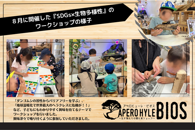 「好きを仕事にしよう!」をコンセプトに、障がいがある方と共に店舗運営をしている就労継続支援B型事業所【世界の植物と昆虫のお店 APERO HYLE アペロヒューレ】。その別館として2022年10月に名古屋市天白区の相生山商店街にオープン。昆虫生体や飼育用品、ウーパールーパー、ベタなどの飼育・販売を行っています。また、今年の7月から8月にかけては『SDGs×生物多様性』と題してSDGsワークショップを開催。子どもたちと生命の尊さ・環境保全を体感型で学び、地球のミライを共に考えました。