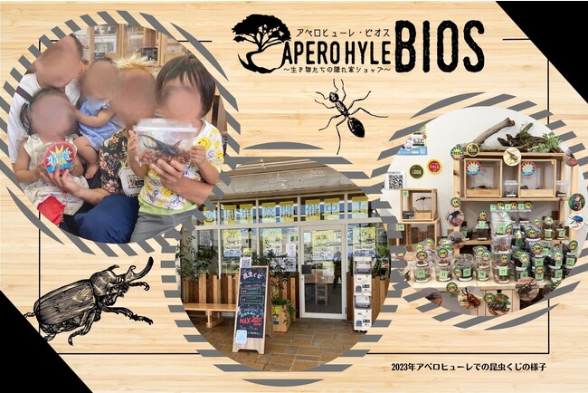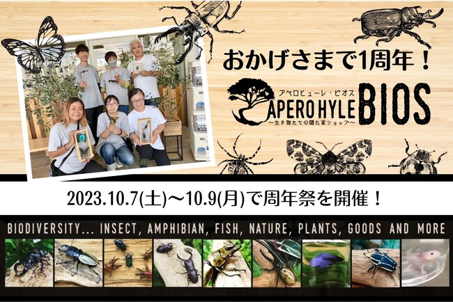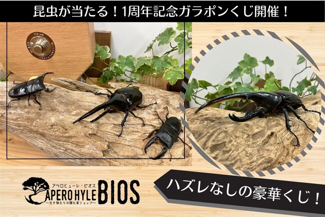 就労継続支援B型事業所【世界の植物と昆虫のお店 アペロヒューレ】の別館としてオープンした【生き物たちの隠れ家ショップ アペロヒューレ・ビオス】は、おかげさまで2023年10月にオープン1周年を迎えます。日頃の感謝の気持ちを込め、昆虫ガラポンくじを開催します。
