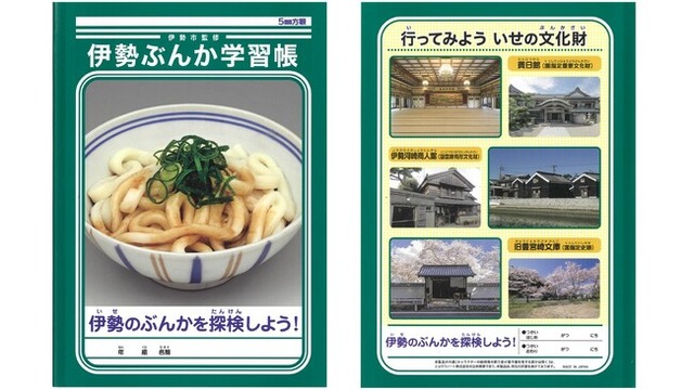 手にした子どもたちが伊勢うどんの歴史や、伊勢の文化財(賓日館・伊勢河崎商人館・旧豊宮崎文庫)に触れるため、それぞれの写真を表紙と裏表紙に掲載しました。B5版で、内面は使いやすい5mm方眼ノートです。