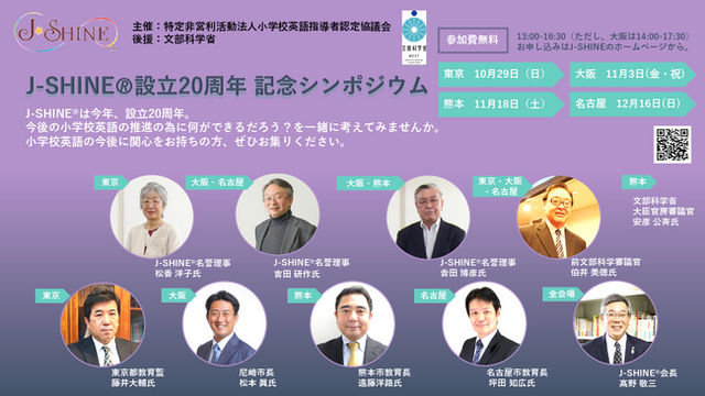 J-SHINE(R)(特定非営利活動法人小学校英語指導者認定協議会/会長高野敬三)は今年で設立20年を迎えました。