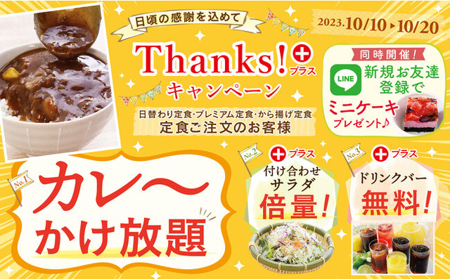この度、日替わり定食・プレミアム日替わり定食・から揚げ定食をご注文のお客様限定!『プラス』な特典をご提供する『サンクスプラスキャンペーン』を開催いたします!
