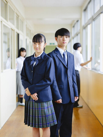 新しい制服には、ネイビーを基調とした無地の布地を中心に、落ち着いた色合いが採用されました。校章は胸元に控えめに配置され、シンプルなデザインを引き立てています。