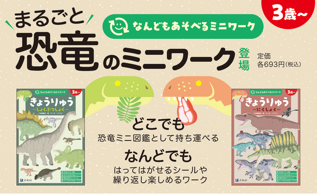 株式会社増進会ホールディングス(Z会グループ)のグループ会社、株式会社Z会ソリューションズは、幼児向けのA5判ミニワーク『なんどもあそべるミニワーク きょうりゅう-にくしょく-』『なんどもあそべるミニワーク きょうりゅう-しょくぶつしょく-』を2023年10月9日に発刊。また、発刊を記念して、『ミニワークきょうりゅうオリジナルARフォトフレーム』を期間限定でプレゼント&SNS投稿キャンペーンを開催。