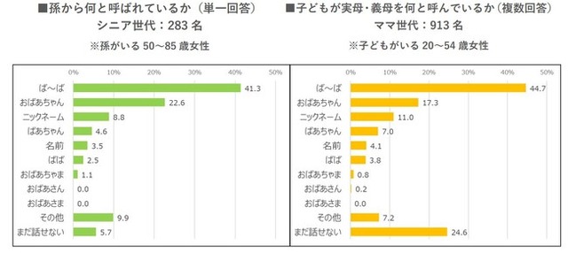 ・シニア世代には孫から呼ばれている呼び名を、ママ世代には子どもが義母や実母を何と呼んでいるか聞いたところ、「ば~ば」と回答した割合がともに最多で、シニア世代は41.3%、ママ世代は44.7%だった。次いで「おばあちゃん」(シニア世代22.6%、ママ世代17.3%)だった。