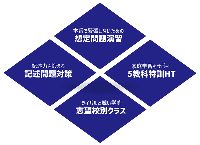 入試本番を想定し、問題を解き解説授業を受講するだけでなく、時間配分や解き進め方などにも意識を払えるよう、模擬入試として試験形式の演習を毎回5教科実施します。また、毎回のテストで志望校別の合格目安点を提示します。入試本番で実力を発揮するために、目標点と自分の点数を照らし合わせ、省みることが可能です。