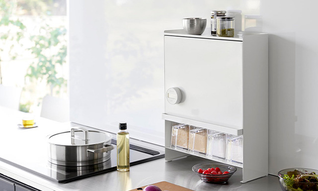 調味料ボトルやスパイス類を隠して一括収納!隠して収納できるので生活感を感じさせません。