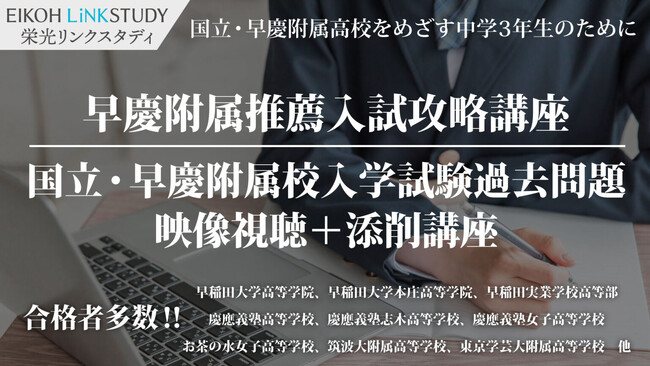 株式会社増進会ホールディングス(Z会グループ)のグループ会社、株式会社栄光(本社:東京都千代田区 代表取締役社長:下田勝昭)が運営する、オンライン進学塾「EIKOH LiNKSTUDY(栄光リンクスタディ)」は、国立・早慶附属高校を目指す中学3年生対を象に、「早慶附属推薦入試攻略講座」と「国立・早慶附属校入学試験過去問題 映像視聴+添削講座」を2023年9月から2024年1月まで開講しています。