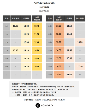 新幹線でお越しの際は是非ご利用ください。なお無料送迎サービスは10月より事前予約制となりますので、Web上で小諸蒸留所のチケットをご購入の際に、併せてご予約ください。