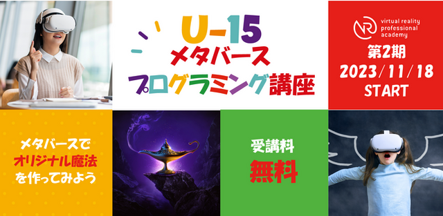 VRアカデミーは、2017年4月開校以来約850名のエンジニアを輩出してきました。日本初のVRに特化したプログラミングスクールとして開校以来6年半の蓄積から、「中学生から少しでも早くVRプログラミングを学習することが、将来のためにBestではないか!」という考えに至りました。そこで、今年は11月より「第2回U-15メタバースプログラミング講座」(受講料無料)を開催します!!ゴール目標は、2024年2月24日(土)開催のVRフェス2024内で開催する「U-15メタバース魔法コンテスト2024」にて、3ヵ月間の講座で作成したオリジナル魔法を発表する事が目標です。