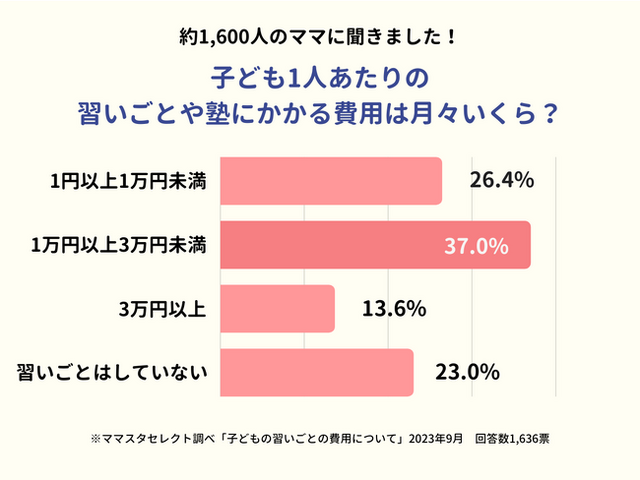 今回ママスタセレクトでは「子ども1人あたりの習いごとや塾にかかる費用は月々いくらですか?」というアンケートを実施。「1円以上1万円未満」「1万円以上3万円未満」「3万円以上」「習いごとはしていない」の4つの選択肢を設定したところ、1,600票を超える回答が集まりました。