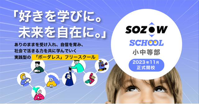 この度、子どもたちの「好き」を活かしながら、社会に存在する「地方と都市」「学校と社会」といった様々な分断(ボーダー)を超えたボーダレスな学びを届けるため、『SOZOW SCHOOL 小中等部』を11月1日(水)に正式開校することにいたしました。平日の昼間に、小学4年生から中学3年生の子どもたちが学校の代わりとして学べるオンラインフリースクールです。