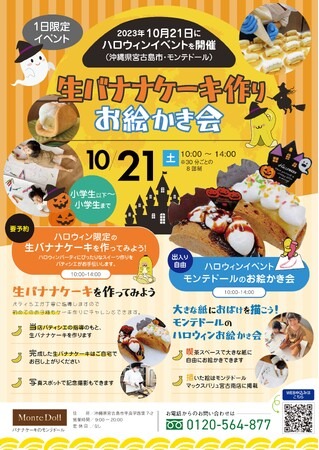 モンテドールのバナナケーキは、宮古島を代表するお土産として愛されて50年以上、お子様にも安心して食べていただける、健康に配慮した”体が喜ぶお菓子作り”に努めてまいりました。 今年の夏に開催いたしました生バナナケーキワークショップがプレスリリース開始から数日で満席となり、おかげさまで大変ご好評をいただきました。 改めてお菓子作りの楽しさと共に、親子が笑顔になれる空間をご提供したいと思い、 皆さまの日常や思い出にそっと寄り添うモンテドールとして、季節を感じるイベントを開催することにいたしました。 楽しいハロウィンを通して普段は出来ない体験と思い出になり、そして、未来の成長につながる貴重な経験になることを願っています。