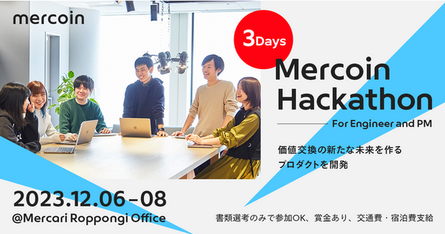 株式会社メルカリの子会社で、暗号資産やブロックチェーンに関するサービスの企画・開発を行う株式会社メルコイン(以下、メルコイン)は、エンジニア・PM(Product Manager)志望の学生を対象としたハッカソン「Mercoin Hackathon」を2023年12月6日~8日の3日間、メルカリ東京オフィスでオフライン開催いたします。以下募集ページより、2023年10月12日~11月10日までの期間、参加申込いただけます。