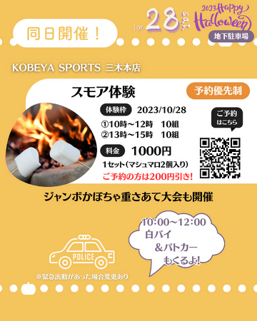 「hoppeハロウィーンラリー」が開催される10月28日(土)、施設内で様々な催しも同時に開催されます。スモア体験やジャック・オー・ランタン作り、じゃがいも販売会、ベーグル&コーヒー販売等がございます。一部、予約優先制となっております。なお、開催時間につきまして、各催しで時間が異なりますのでご注意ください。ぜひ、この機会にこちらのブースもお楽しみください。