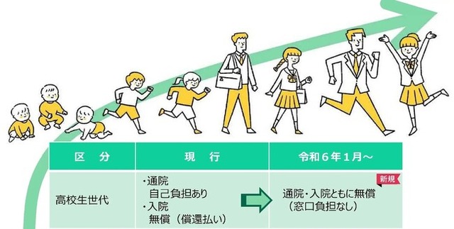 その中で経済的な負担軽減として、令和6年1月1日診療分より、子どもの通院医療費の無償化を高校生世代まで拡充します。