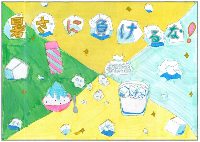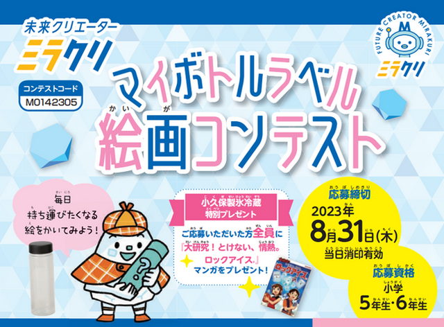 「未来のマイボトルラベル 絵画コンテスト」は、副教材で得た知識などをもとに子どもたちの豊かなアイデアを発揮する場として開催し、今回は「マイボトルラベル」をテーマに、「こんな絵のボトルだとワクワクするな」、「こういう絵なら、いろんな人が使えそう!」などあったらいいなと思うマイボトルラベルを募集。全国の小学生=未来クリエーターからたくさんの作品が集まりました。その中から「ロックアイス賞」1名、「ミラクリ賞」1名、「未来賞」5名が選ばれましたが、このうち「ロックアイス賞」と「ミラクリ賞」の2作品をご紹介します。