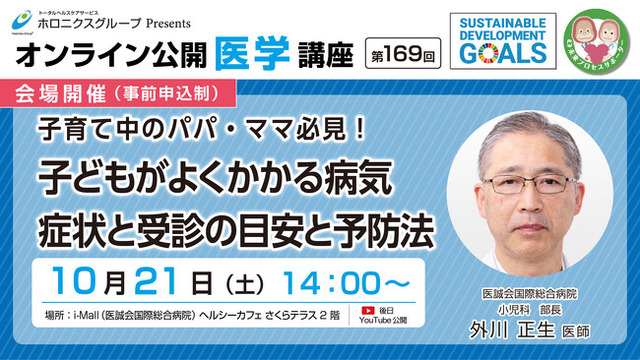 医療法人医誠会(大阪府大阪市 代表者:谷 幸治)では、第169回オンライン公開医学講座 『子育て中のパパ・ママ必見!子どもがよくかかる病気 症状と受診の目安と予防法』を2023年10月21日(土)に同年10月2日にオープンしたi-Mall内ヘルシーカフェ「さくらテラス」にて開催いたします。