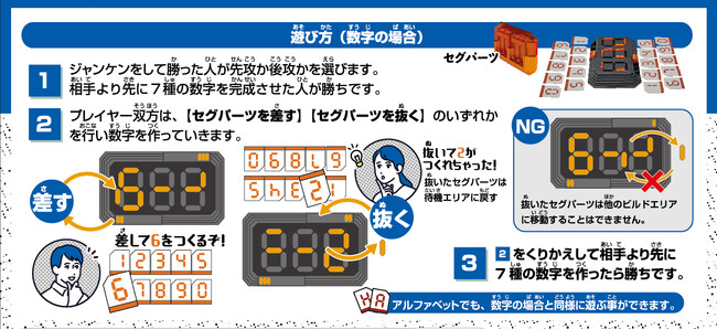 ナンバービルドは、2名のプレイヤーで対戦するゲームです。まず、プレイヤーにはぞれぞれ「0」から「9」までの記載のあるカードが10枚配られます。プレイヤーは本体を挟んで対峙し、3つのエリアに文字を構成するセグパーツを、交代に「挿す」か「抜く」かを行いながら、自分から見た方向で「0~9」のいずれかの数字を作っていきます。次に、数字を完成させたらその数字が書かれている自分のカードを裏返します。以上を繰り返し行い、7種の数字を先に完成させカードを7枚裏返しにした方が勝ちとなります。完成させる数字は、3つのエリアどの場所でもかまいません。また、数字カードの他にもローマ字カードも同梱しており、ローマ字を作るゲームとしてもお楽しみいだけます。