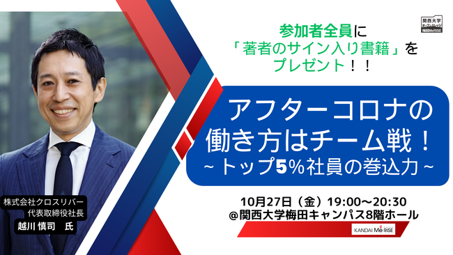 このたび関西大学では、公開講座「アフターコロナの働き方はチーム戦!~トップ5%社員の巻込力~」を、10月27日(金)19:00から、関西大学梅田キャンパスにて開催します。本講座では、株式会社クロスリバー代表取締役の越川慎司氏が講師として登壇します。