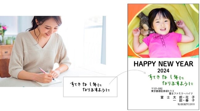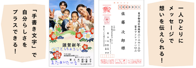 写真を使った年賀状は、文字だけでは表現できないリアルな姿を伝えることができます。当社は、送り手の想いが年賀状を受け取る方により一層伝わるように、昨年より自分で書いた文字やイラストをテンプレートに合成できる「手書き機能」サービスを提供。さらに今年はハガキの宛名面に、送る方一人ひとりに個別メッセージを入れられる「ひとことコメント機能」を新たに搭載し、より想いがこもった年賀状作りができるようになりました。
