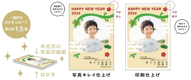 また、画質が良く、しっかりとした厚みで高級感のある年賀状で想いを伝えたいというより多くの方に、「フジカラー仕上げ」による高品質な仕上がりを実感いただくため、「写真キレイ仕上げ1枚無料でお試しキャンペーン」(※4)を実施します。今年のデザインラインアップの中からお好きなデザインを選んでいただき、ご自分の写真を使用してオリジナルの年賀状を1枚無料で作成・注文が可能。注文いただいたお試しの年賀状を郵送でお送りします。お手元に届いた年賀状が気に入れば、年賀状を購入注文する際、作成したデータをそのまま使用することも可能です。