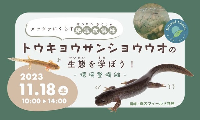 国内最大級の北欧のライフスタイルを体験できる施設「メッツァビレッジ」(埼玉県飯能市)は、生きもの観察のプロと絶滅危惧種を知るフィールドワークイベントの第1弾、地球環境を考慮したオリジナルブランド「Ethical Choice(エシカル・チョイス)」の第9弾として「メッツァにくらす絶滅危惧種 トウキョウサンショウウオの生態を学ぼう―環境整備編-」を2023年11月18日(土)に開催します。