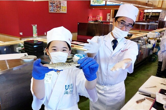 「アジのさばき体験」は、参加者1人につき1人の職人が教えるとても豪華な体制で行われました。回転ずしレーンの内側、普段は職人しか入れない調理スペースでアジをさばきます。初めてアジを触ったという参加者は「魚をさばけるか不安だったけど、優しく教えてくれてなんとかさばけました。他の魚もさばいてみたい」と話してくれました。
