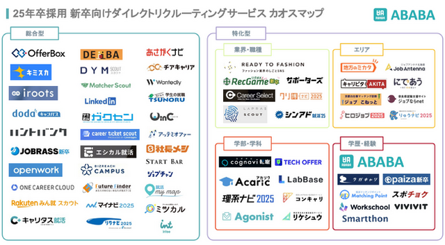 株式会社ABABA(本社:大阪府吹田市、代表取締役:久保駿貴、中井達也)は、新卒採用におけるダイレクトリクルーティングサービスをまとめた「25年卒採用 新卒向けダイレクトリクルーティングサービス カオスマップ」を公開しました。