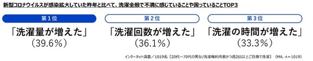 1位「洗濯量が増えた(39.6%)」、2位「洗濯回数が増えた(36.1%)」、3位「洗濯の時間が増えた(33.3%)」