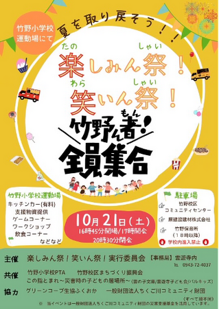 そして、夏休みが終わり、秋を迎えた今。まだ終わらぬ災害復興への想いを新たにしながら、子どもたちが例年の夏休みのようにできなかった思い出をつくってほしい。そんな願いを込めて、地元の方々が中心となって、竹野小学校に通う児童と親のために「楽しみん祭!笑いん祭!」を開催することになったのです。グリーンコープふくおかもこうした想いを共有したことから、今回の協力となりました。
