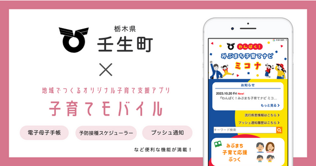 妊婦・子育て家庭に寄り添う「伴走型相談支援」のより一層の充実を図るため、「出産・子育て応援交付金(*)」を活用し、栃木県内6自治体でも取り入れられている 子育て支援アプリ「子育てモバイル」を導入する運びとなりました。壬生町オリジナルのデザインを施し、子育て支援アプリ「わんぱく!みぶまち子育てナビ ミコナ 」として提供いたします。
