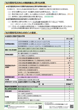 このため、ゼロカーボン北海道の実現に向け、高い省エネ性能を有する「北方型住宅2020」をベースに、更なる断熱性能の強化、再生可能エネルギーの活用、道産木材の活用などの脱炭素化に資する対策を地域特性等に応じて組み合わせる「北方型住宅ZERO」を創設しました。