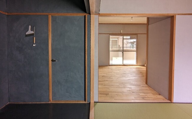 今回の改装では、それぞれの部屋の床をフローリング、畳、Pタイルで構成しました。壁面のやすりのザラザラとした質感と同時に、足元の質感のバリエーションを、生活の中で楽しんでもらえたらと思っています。