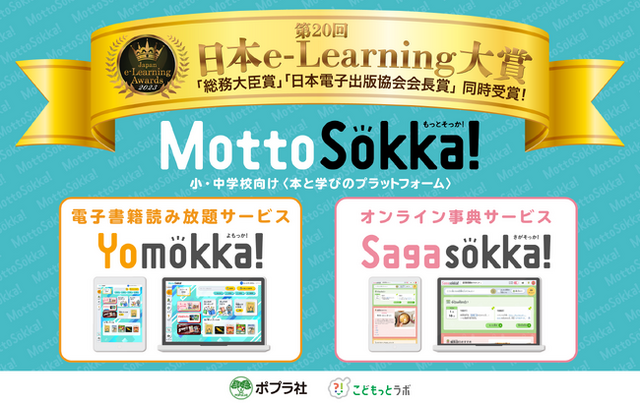 株式会社ポプラ社(本社:東京都千代田区、代表取締役社長:千葉均)が提供する小・中学校向けの教育ICTプラットフォーム『MottoSokka!(もっとそっか!)』が、一般社団法人日本オンライン教育産業協会(JOTEA) / 株式会社産経新聞社が主催する 「第20回(2023年度)日本e-Learning大賞」にて「総務大臣賞」と「日本電子出版協会会長賞」を同時受賞したことをお知らせします。