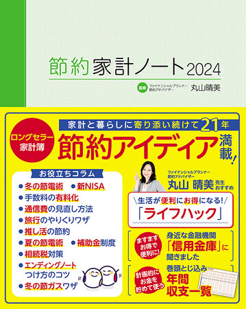 丸山晴美さん監修の「節約家計ノート」の特長は、使い勝手の良い収支表。カレンダーも付いているので予定を書き入れることもでき、家庭のどんなイベントの際にどれだけお金を使ったかが記録できます。節約の豆知識や金融商品に関するコラムも散りばめ、2024年版では「新NISA」や「手数料の値上げ」、「夏の節電術」などに関するコラムを掲載しています。