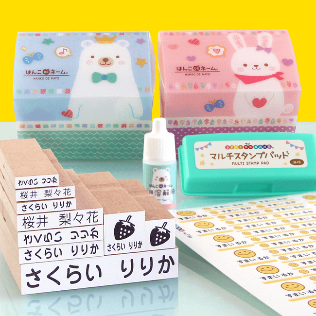 ■セット内容:防水お名前シール、お名前スタンプ8本、ぷちスタンプ1本、マルチスタンプパッド、インク溶解液、収納ケース(デコシールつき)