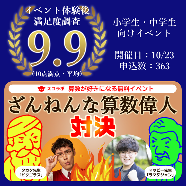スコラボではこのような「楽しい学び」のための様々な教育ライブを受講できます。10/23(月)に実施した、マッピー先生とタカタ先生による「ざんねんな算数偉人対決」イベントでは、全国の小学生・中学生からの363件のの申し込みがあり、終了後の参加者アンケートの満足度は10点満点中9.9でした。